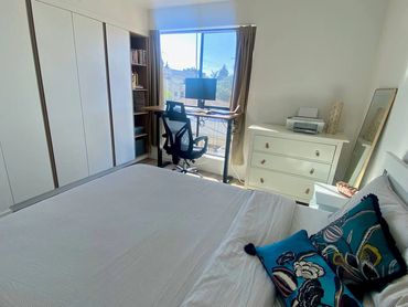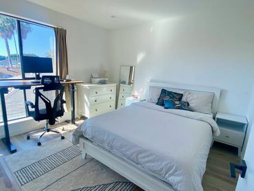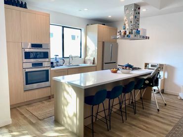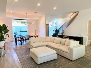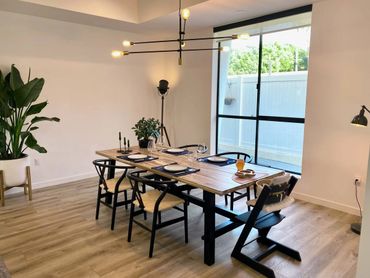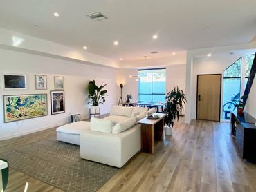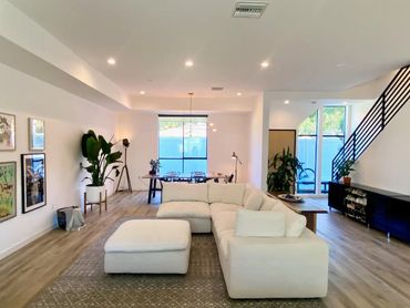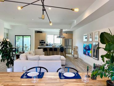 Modern luxury townhouse in Culver City consisting of spacious living room with huge sectional, art wall with 65" TV, dining table for six, open kitchen with breakfast bar, outdoor patio and toilet. The second floor has 3 bedrooms and 2 bathrooms, there is a rooftop with city views, lounge area and gym equipment. Wifi, Sonos speakers and smart lighting throughout the house. Parking garage for two cars and access gate secured with code. Located next to a park popular with young children.
